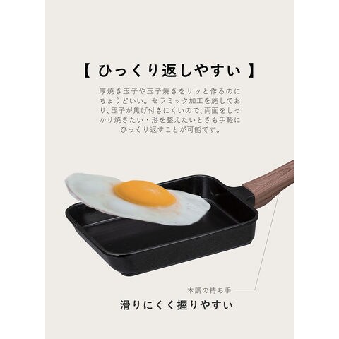 特徴:【ひっくり返しやすい】厚焼き玉子や玉子焼きをサッと作るのにちょうどいい.セラミック加工を施しており、玉子が焦げ付きにくいので、両面をしっかり焼きたい・形を整えたいときも手軽にひっくり返すことが可能です.