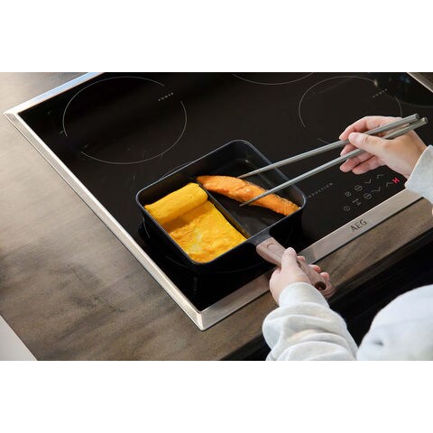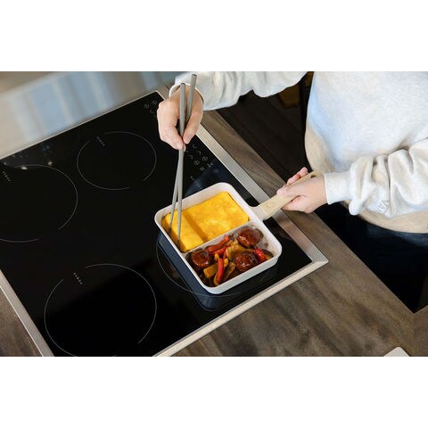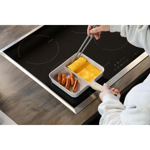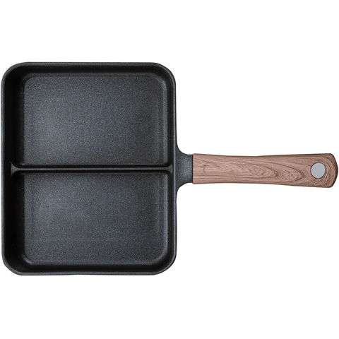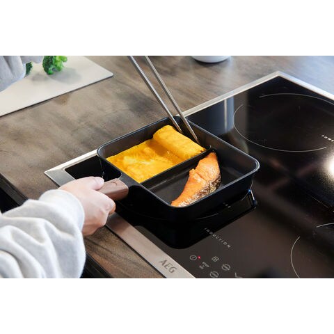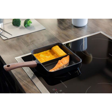 仕切り付きなので、卵焼きと焼き鮭など2品を同時に調理できる[copan(コパン)IH対応二品同時に作れるフライパンMC]木調のハンドルは見た目だけではなく、滑りにくく握りやすい仕様.お弁当作りや朝食作りなど忙しい朝にぴったり.IH200V、ハロゲン、ラジエント、シーズ、エンクロ、ガスと幅広い熱源にも対応しています.本体はハンドル部分まで一体成形なので、汚れが溜まりにくく洗いやすい.内面はふっ素樹脂塗膜加工なので、汚れが付きにくく落ちやすい.耐熱性も高く食材に熱が伝わりやすいのも特徴.表面は熱伝導性が高く、内部は蓄熱性に優れているため、全体へ熱が伝わり、食材を包み込むように加熱し、中まで火が通りやすいです.