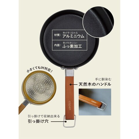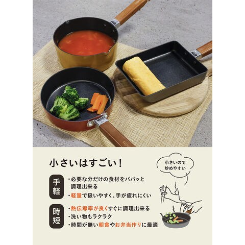 ちょこっと炒め物をするのにちょうどいい、IH対応ちょこっとフライパン16cm.お弁当に入れるおかずだけ、パパッと調理出来るので洗い物もラクラク.あと一品おかずを足したいときや、朝食をサッと作りたいときにおすすめなミニサイズのフライパン.熱伝導率が良く、時間のない朝でも直ぐにおかずを作れます.内面はふっ素加工なので、柔らかいスポンジと中性洗剤で洗い流すだけ.汚れが付きにくく落ちやすい.軽量で扱いやすいので疲れにくいのも特徴.シンプルで飽きのこないデザインで、ちょこっとシェフ気分が味わえます.吊るして収納できるので、気軽に毎日の料理をもっと楽しみましょう.