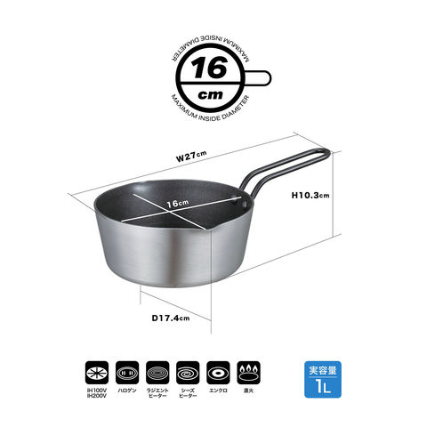 素材:[主材質]本体/アルミニウム合金・ステンレス鋼、ハンドル/ステンレス鋼、[表面加工]内側/ふっ素樹脂塗装加工、外面/サテン仕上げ