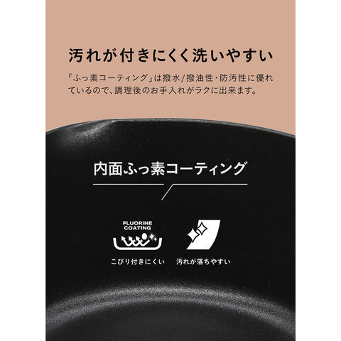 素材:[主材質]本体/アルミニウム合金・ステンレス鋼、ハンドル/ステンレス鋼、蓋/ステンレス・ガラス、つまみ/フェノール樹脂、[表面加工]内側/ふっ素樹脂塗装加工、外面/サテン仕上げ