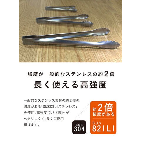 先細タイプなので薄いお肉から厚いお肉までひっくり返すのに便利な[焼肉に便利な菜箸トング28cm]焼き加減を確認したいときも、つかみやすくて便利.一般的なステンレス素材に比べ、食材を掴むときも軽量で扱いやすい[SUS821L1ステンレス]を使用しています.高強度でバネ部分がヘタリにくく、長く使えます.高耐食性にも優れているので、塩素や水に強いのも特徴.調理時間をより快適に、長く使える日本製のトングです.