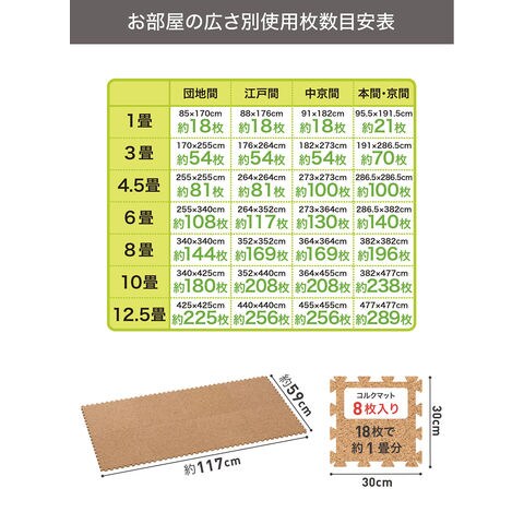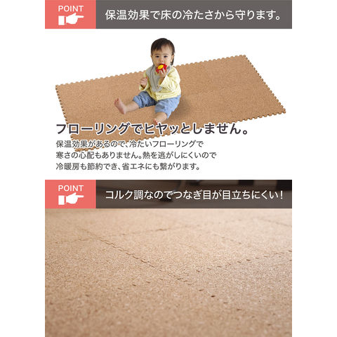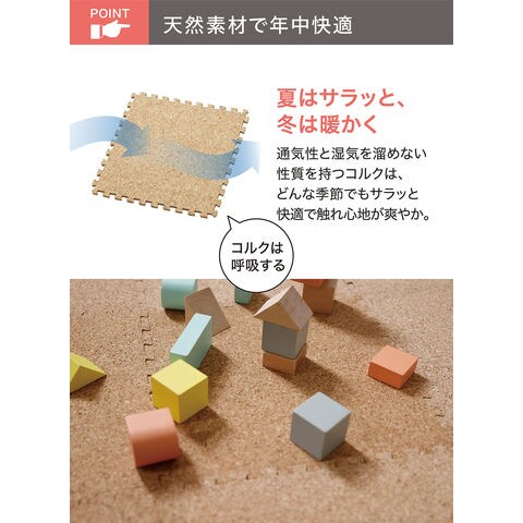 夏はサラッと、冬は暖かく.好きな形につなげて敷けるクッション性のある[やわらかコルクマット細目8枚組]表面がコルクなので、つなぎ目が目立ちにくい.