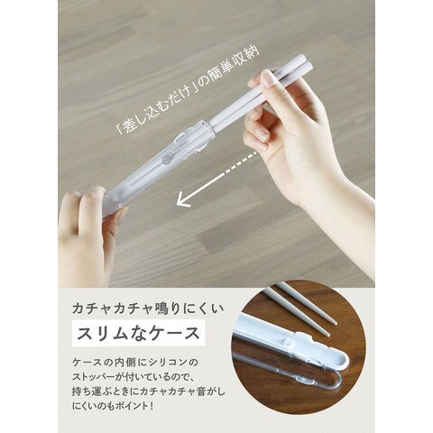 ケースの内側にシリコンのストッパーが付いているので、持ち運ぶときにカチャカチャ音がしにくいのもポイントです.ケースは開いて洗えます.さらにお箸もケースも食器洗浄機対応なのでお手入れも簡単!