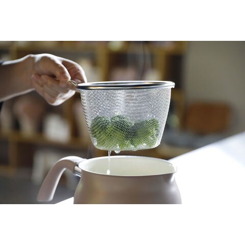 サイズ:商品セット状態/W25.5×D17×H15cm、鍋/W25.5×D17×H10cm、ザル/W25×D15×H11cm、蓋/φ14.5×H5.5cm、最大内径/16cm、底の厚さ/2.0mm(はり底を含む)