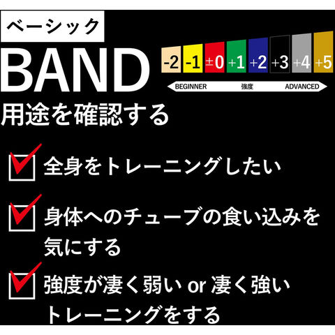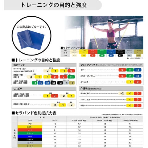 1mサイズでセラバンドトレーニングが初めての方でも始めやすい.ベーシック:4段階の強度展開で、目的に合わせて選びやすい.握りやすい帯状で、全身のあらゆる部位のエクササイズに対応.