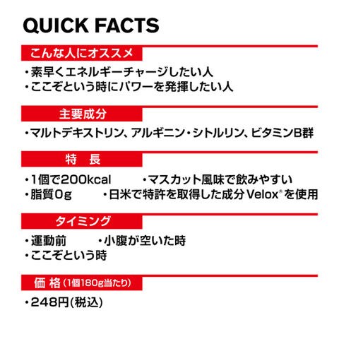 動くなら、摂れ.何かを成すにはエネルギーがいる.もはや常識といってもよい.これは運動するときはもちろんのこと、それに限った話ではない.仕事をしているとき、勉強しているとき、重要な勝負に向かうときなど様々なシチュエーションが存在するが、とにかく何かを成すにはエネルギーが必要なのだ.[エナジーゼリー]は、短い時間で高いエネルギーが確保でき、かつ、人間の様々なパフォーマンスをサポートする成分が配合されている.何かを成し遂げるなら、エナジーゼリーで、エネルギーを補給しろ.※こちらの商品は返品、交換はお受けいたしかねますのでご了承ください.