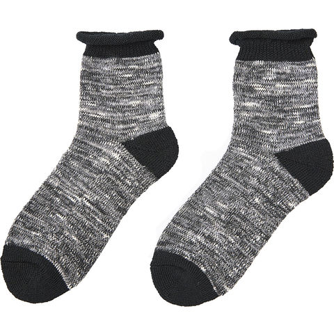 あたたかく肌にやさしい、天然ウール使用のルームソックス.熱を逃がさずあったか.ウールを使用したルームソックス.ゆったりとした履き口で締めつけによる不快感を軽減.足底は極厚パイル仕様で、足の負担と床からの冷気を防いであったか.