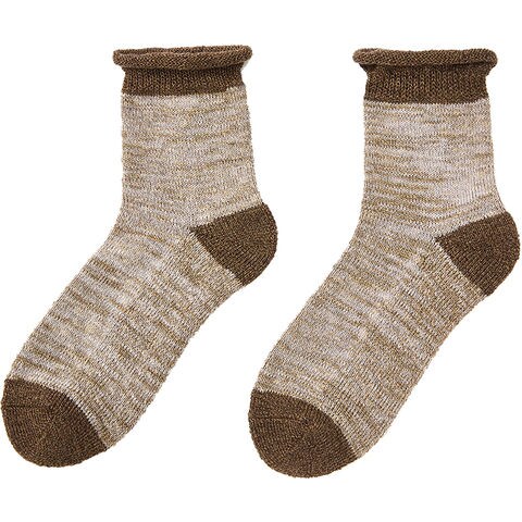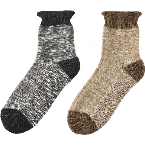 あたたかく肌にやさしい、天然ウール使用のルームソックス.熱を逃がさずあったか.ウールを使用したルームソックス.ゆったりとした履き口で締めつけによる不快感を軽減.足底は極厚パイル仕様で、足の負担と床からの冷気を防いであったか.