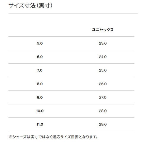 サイズチャート:5/23.0cm、6/24.0cm、7/25.0cm、8/26.0cm、9/27.0cm、10/28.0cm、11/29.0cm