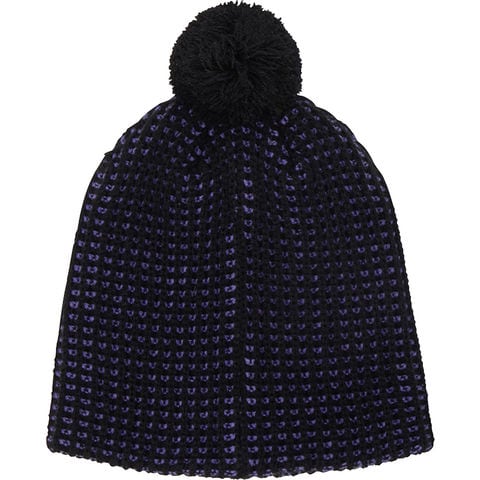 凹凸感の特徴ある編地で保温性を高めたビーニー.2色のリサイクル糸を使用.ワッフル長の編地で暖かい空気を滞留させた保温性のあるビーニー.リブがないためゴーグルをしても隙間ができにくく行きの侵入を防ぎます.