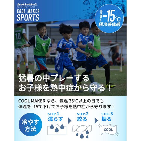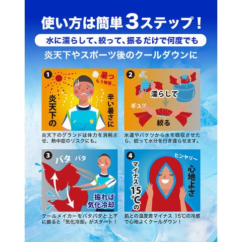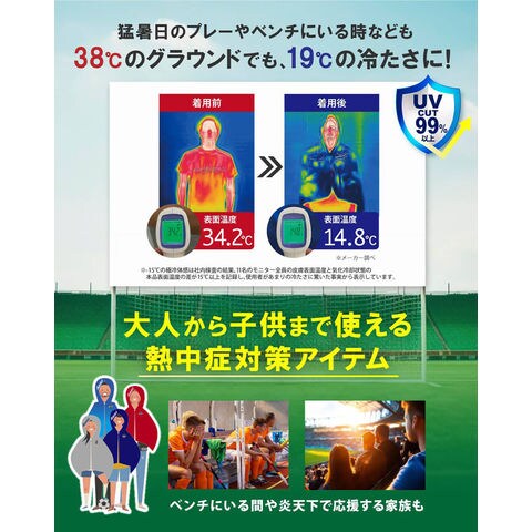 COOL MAKERは冷却タオルポンチョです.濡らして絞り、振るだけで生地が-15℃の冷感を発揮し、体の中心温度を効果的に下げます.UVカット99で、強い日差しからもしっかりガード.夏のスポーツを頑張るお子様を熱中症から守りたい親御さん、暑さと戦うアスリートのパフォーマンス維持に最適!試合前後のアイシングやクールダウンにも大活躍.プレーヤーだけでなく、熱中症やUVダメージを防ぎたいすべての方におすすめです.