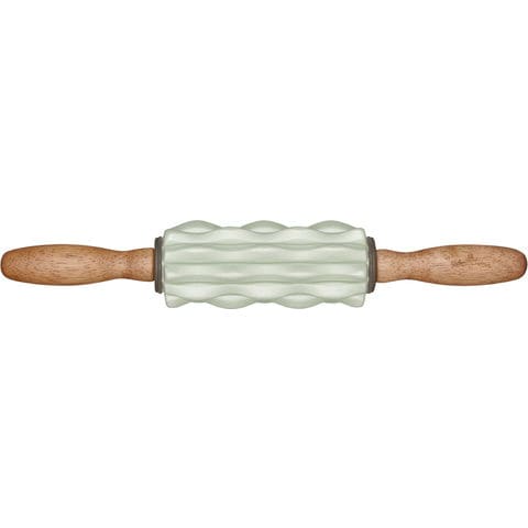 ウェーブ形状&もちもち素材のローラーでやさしく伸ばす.インテリアに馴染む持ち心地の良い木のグリップ.