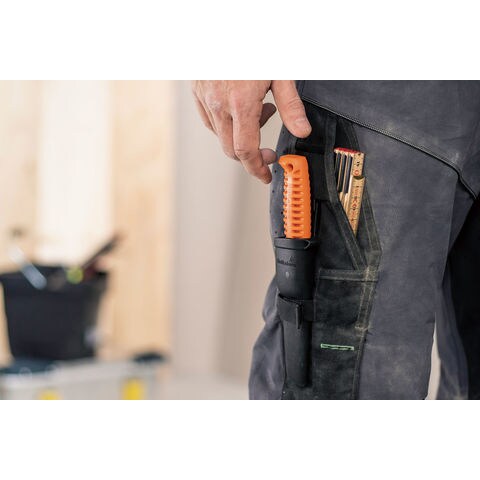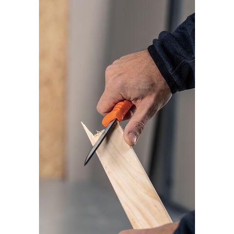 環境負荷を低減するために、ハンドル部分の材料を節約しています.ハンドルには耐久性に優れたバイオベースのHDPEプラスチックを採用し、ストラップ用の穴が開いており、高所作業の際にリシューコードなどで固定することができます.刃先は数段階に分けて研がれており、最終的には革製のストロップ(革砥)でホーニングされています.