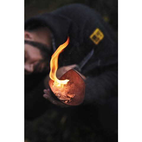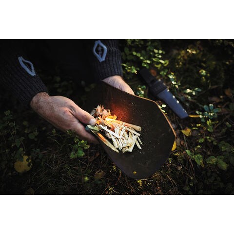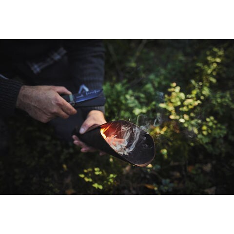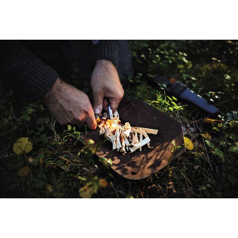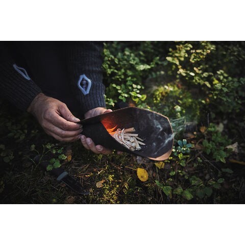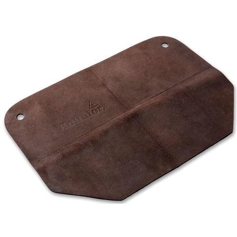 手元でナイフやアックスを使用するときに脚や膝を保護します.また火起こしをするときにも最適な場所になり、火起こしした火を簡単に暖炉に移動させることができます.防水レザーはシートパッドにもなります.