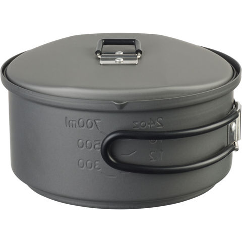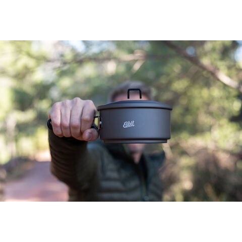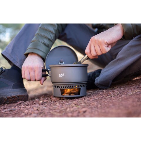 夜空、キャンプファイヤー、そして静かに沸き上がる熱いお茶.冒険家なら誰でも一日の終わりにご馳走を食べたいものです.1000mlの固形燃料用クックセットは、非常に軽量な硬質アルマイト製で、五徳とポットで約314gと軽量です.エスビットの固形燃料ミリタリー1個で簡単炊飯はもちろん、間口が広いので調理しやすく一人鍋にも最適なサイズです.調理中は蓋を鍋の縁に掛けておけるので便利です.風防にもなる五徳はポットの中に収納しコンパクトに持ち運べます.五徳を収納しても調理器具やインスタント麺など食糧を入れるスペースがあります.