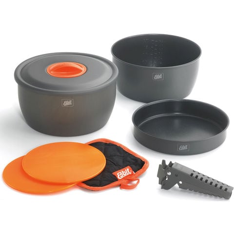 軽量、ハードアルマイト加工されたクックセットです.付属のポット(2個)とパンに焦げ付き防止処理が施されています.EsbitはNATO軍標準装備品ブランドです.