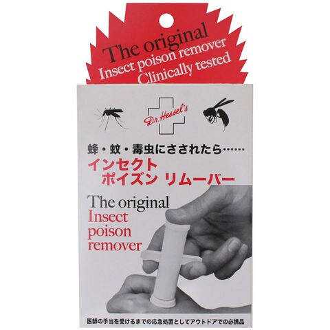 インセクトポイズンリムーバーは蜂、蚊、毒虫等に刺された時、毒液を吸引作用で抽出する応急手当器具です.小型で軽く、誰にでも手軽に使用でき、傷口に応じてカップ両側のマウスピース面を差し替えて使用できます.ご使用後、先端のマウスピースを洗浄すれば繰り返しご使用いただけます.インセクトポイズンリムーバーは1983年に発売されてから30年以上にわたり世界で使われ続けています.【※ご注意※】医師の手当てを受けるまでの応急処置です.必ず専門医の地調を受けてください.