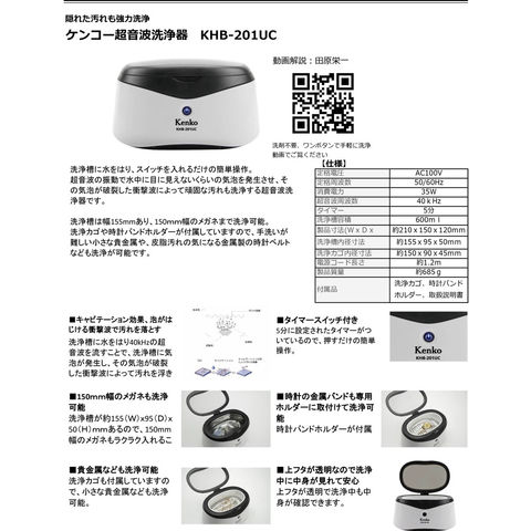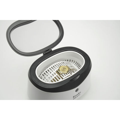 洗浄槽に水をはり、スイッチを入れるだけの簡単操作.超音波の振動で水中に目に見えないくらいの気泡を発生させ、その気泡が破裂した衝撃波によって頑固な汚れも洗浄する超音波洗浄器です.洗浄槽は幅155mmあり、150mm幅のメガネまで洗浄可能.洗浄カゴや時計バンドホルダーが付属していますので、手洗いが難しい小さな貴金属や、皮脂汚れの気になる金属製の時計ベルトなど.