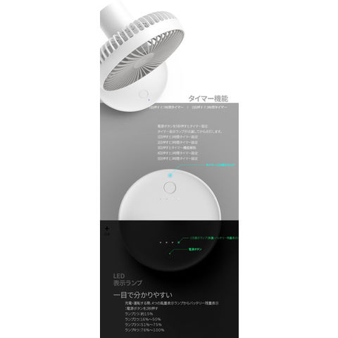 仕様:消費電力/5W、Input/DC5V1.2A(MAX)、バッテリー仕様/Li-ion 18650-3.7V4、000mAh、バッテリー効率/フル充電1、000回以上、使用時間/最大風速4時間-最低風速2時間、充電時間/4時間