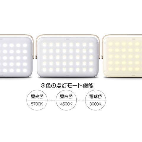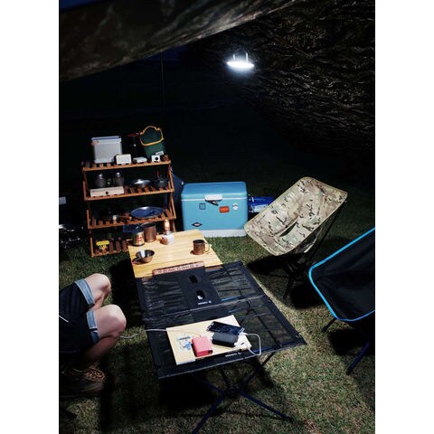 仕様:明るさ(切替え4段階)/150~1800Lm、緊急SOSフラッシュ、LED色温度/昼光色(5700K)・昼白色(4500K)・電球色(3000K)、バッテリー容量/Li-Polymer20000mAh、入力/DC5V 2.1A・DC9V 1.7A、出力/DC5V 2.1A、90度回転ハンドル