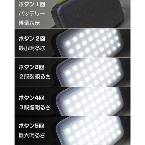 機能:モバイルバッテリー機能(タブレット・スマートフォン・デジタルカメラ・携帯型ゲームなどへの充電も可能)、パワーセービング機能(最大明るさ使用時、90の電力消費した場合、モード4(最大)からモード1(最小)へ自動切替えで30分使用可)