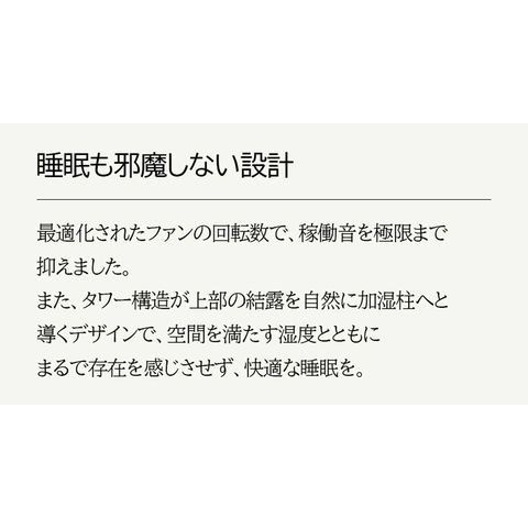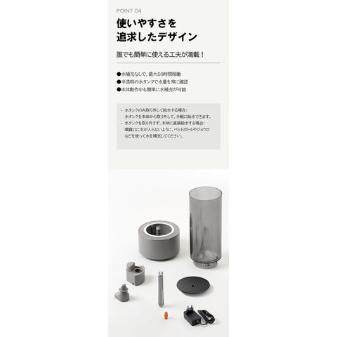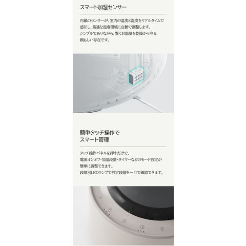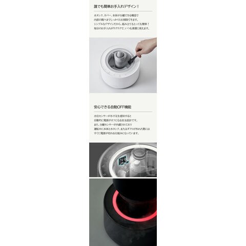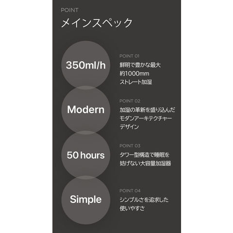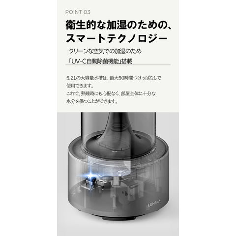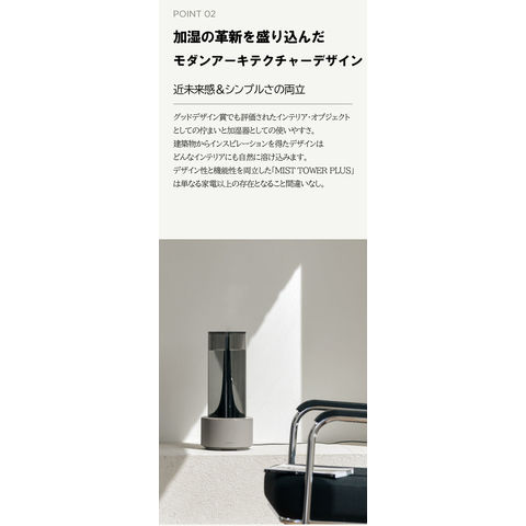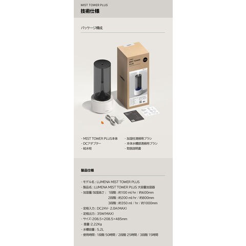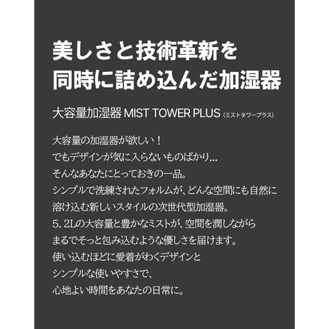 LUMENAMISTTOWERPLUS のデザインは、優雅な曲線の形状や重みのある下段部など、建築物からのインスピレーションに基づいて実現しました.大容量水槽や半透明の水槽筒など、製品の使いやすさや機能性にもこだわりました.その結果、直観的な操作と健康的な加湿を提供する優れたデザインとなりました.また、シースルーな水タンクによって、残った水の量が確認できるので、使用しながら手軽に水を補充することが可能です.ポイント 1/ 建築物からインスピレーションを得た柔らかく高くそびえる曲線の形状で最も効果的かつ美しい加湿形態を表現.ポイント 2/ 電源線を取り外さずに使用中に水の補給が可能であり、 4.3L の大容量水槽で最大 40 時間の使用が可能.ポイント 3/ ・