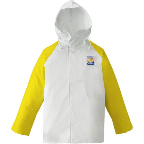 仕様:高周波ウェルダーによる溶着で防水加工、表地に高品質塩化ビニールと特殊フィルムを配合し、耐油性と抜群の耐寒性を実現、フード一体型、遠洋・中近海作業、湾岸作業、養殖業、水産加工業、袋入り、パーカータイプ、おしゃれなツートンデザイン