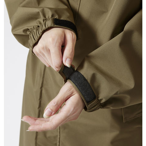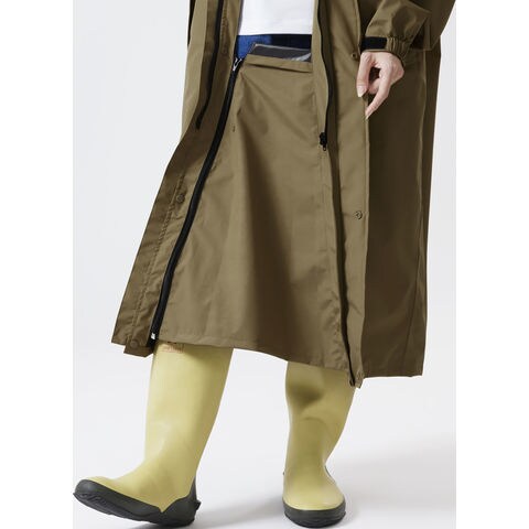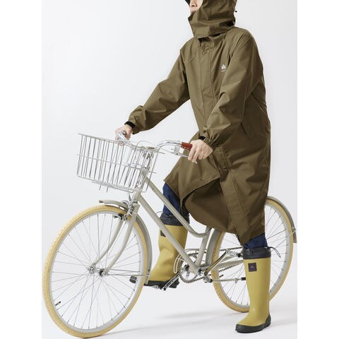 雨の日の自転車運転に便利な機能がついた、デザイン性と機能性を兼ね備えたサイクルレインコート.ヘルメットやリュックの上からも着用でき、自転車にまたがった際に足元へ雨の浸入を軽減するマチを搭載するなど、嬉しい機能が満載.防水透湿素材を採用し、縫い目にはシームテープ処理を施して高い耐水圧を実現.強い雨でも水がしみ込む心配がなく、ムレにくい快適な着心地です.また、胸元と袖口 2 箇所にリフレクタープリントを配置しており、雨の日や夜間の視認性を確保.フードは襟部分に収納することができ、日常使いもしやすいユニセックスデザインです.