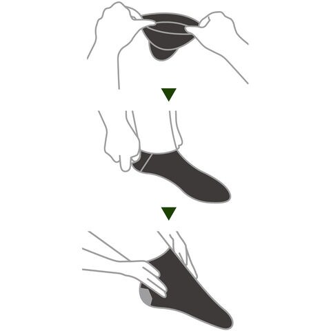 特徴:テーピングの効果を靴下で体感.アーチの保持機能 UP .踵から足底を通り足の親指甲側に向かってテーピングを施すことで足底横アーチを補助し、歩行時の安定性・衝撃をサポート.【着用方法】 (1) 口ゴムの裏側にある表示を確認します.右足用には[ R ]、左足用に・