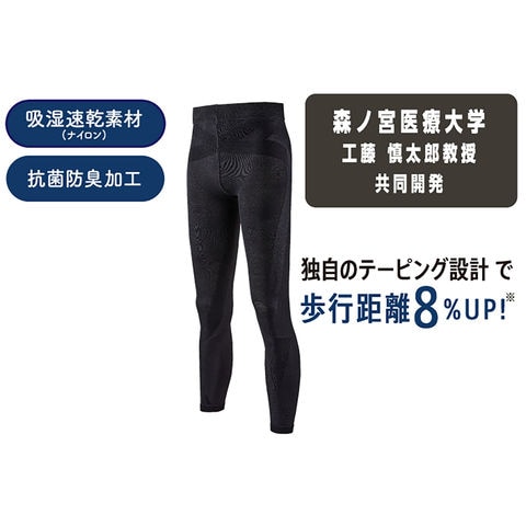 森ノ宮医療大学との共同開発により誕生した、履くだけでテーピングのサポート効果を体感できる高機能レギンス.理学療法の視点に基づく 7 つのテーピングラインが、骨盤やひざなどの主要な関節をしっかり支え、動きの安定性と負担軽減をサポートします.吸湿速乾・抗菌防臭機能付きで日常でも快適に使え、紫外線対策としてもおすすめ.日常のウォーキングや立ち仕事など、幅広いシーンで活躍する 1 本です.