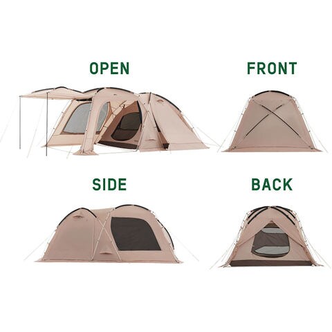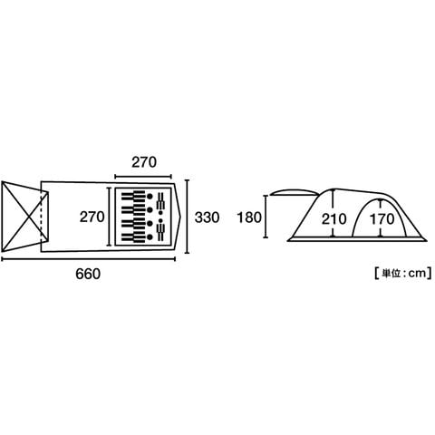 仕様:構成 :フライシート、インナーテント、カーセット用ジョイント× 2 、メインフレーム ( インナーテント側 ) × 2 、サブフレーム ( リビング側 ) × 2 、パネルフレーム× 2 、キャノピーポール× 2 、ペグ× 26 、ロープ× 12 、収納バッグ、フレーム用収納袋、ハ・