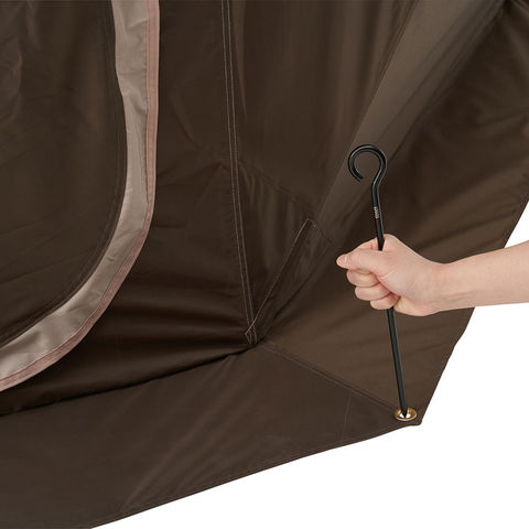 組み立て3分!耐風性に優れた大型ドーム.幅およそ3mの大型ドームにかかわらず、パネルを搭載したシステムにより約3分で組み立て可能!どんぐりに似た形状がユニークなドーム型タープです.生地とフレームが一体になっているので、パーツが少なく、設営も簡単.ハーフフライがついているので、日差しをやわらげる事が出来ます.また、スコープウィンドウがついているので、星の観察には最適で、冬にはワカサギ釣りなど、色々なアクティビティに活躍します.雨の浸入や風の吹き込み、冷気を防ぐマッドスカートを内側と外側に装備.別売りのグランドシートを敷くことでマッドスカートと重なり、より快適な居住空間を実現します.持ち運びに便利な収納バッグ付き.