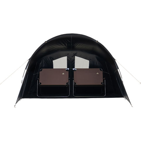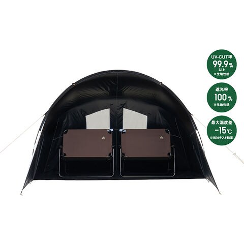 家族 4 人がチェアに並んで座れるワイドサンシェード!超強力 UV-CUT .ソーラーブロック加工生地を使ったドーム型シェルターは、驚異の UV-CUT 率 99.9% 以上・遮光率 100% で、日向と日陰で最大 -15 ℃の温度差を生みだす ( ※ LOGOS 社調べ ) . 2 人掛けチェアを横に 2 脚並列できるほどの広さを有し、開口部が広いので見晴らしも抜群.家族や仲間と一緒に風景を楽しめます.背面下部には風抜き用のベンチレーションを設置することで室内の通気性が向上.フロアシートの壁面を一部立ち上げ、砂や土が入りにくい構造です.※付属品のペグは、晴天無風の整地された環境下でのご使用を想定した製品仕様となります.悪天候や不整地な状況下でご使用される場合は、状況に適