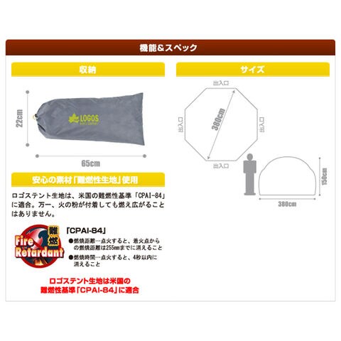 オクタゴン専用インナーテント.別売の『スペースベース・オクタゴン』を居住スペースにします.吊り下げ式で簡単設営.着脱式でフックを引っかけるだけで簡単に設営できます.広い居住空間を確保します.ロゴスのテント生地は、米国の難燃性基準[CPAI-84]に適合.万一、火の粉が付着しても燃え広がることはありません.※本品はインナーテント単体です.スペースベースオクタゴン、グランベーシックスペースオクタゴンは商品に含まれておりません.
