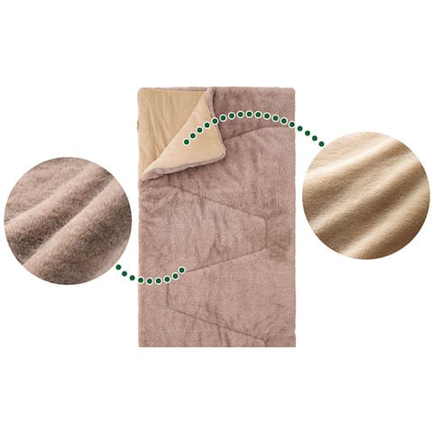 まるでラビットファーのような極上のふわふわ感.ずっと触っていたくなるようなラビットファー風生地と、柔らかフランネル生地のシュラフは、丸洗い対応でお手入れ簡単.ラビットファーのような毛足の長い素材を採用し、極上のふわふわ感を実現.リバーシブルでお好みの生地を肌面にして使用できる.中綿には軽さと保温性を兼ね備えたダイナチューブファイバーを使用.同一シュラフで連結してダブルサイズにすれば親子で添い寝もできる.クッション型収納袋付きで、収納時はクッションとして使ったり、部屋に敷いてラグとしても活躍する.