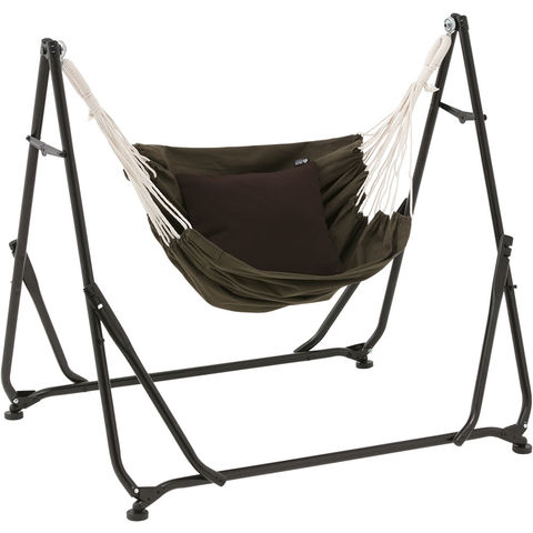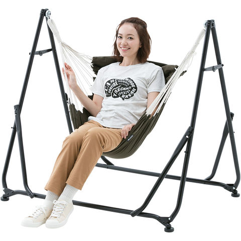 機能:使い方3WAY(ハンモック・ハンモックチェア・ハンガーラック)/接地面に合わせて先端部が可動する脚フレーム/フレーム本体にベアリング式フックを採用.快適なスウィングが可能/座面はコットン生地を採用/収納バッグ付き