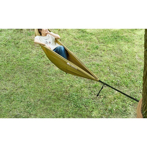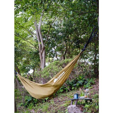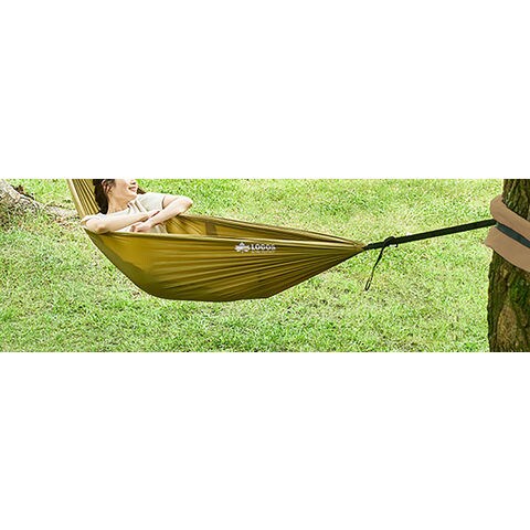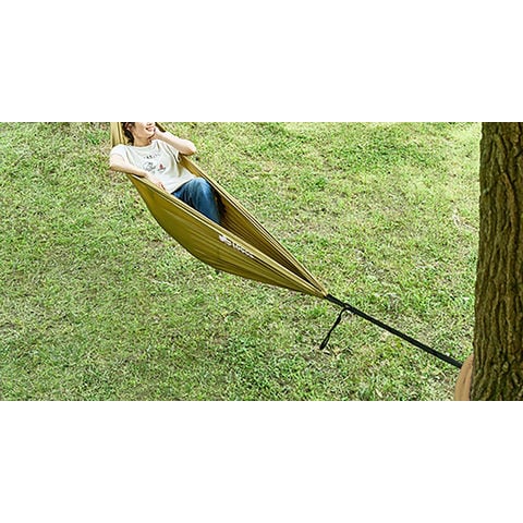 木の幹にベルトを巻くだけ! 簡単セットハンモック.付属のベルトを 2 本の木に巻きつけ、カラビナで固定するだけで設置完了のお手軽ハンモック.収納すれば手のひらサイズになるため持ち運びしやすい.ベルトが長めの作りなので、太い幹の木や広い間隔に対応します.耐荷重約 100KG と頑丈で、大人でも安心して寝ることができます.