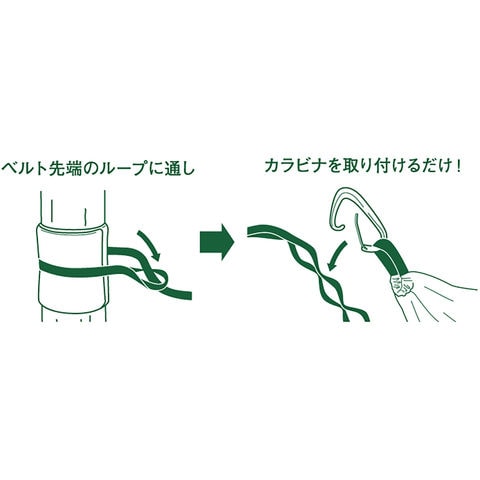 木の幹にベルトを巻くだけで、簡単セットアップ / 木の幹にベルトを一周巻くだけの簡単セット.ベルトを巻いてループに通してカラビナを取り付けるだけ.素早く簡単にセットできるから手軽にハンモックを楽しむことができます.推奨する木の間隔 :6 ~ 7M .※木を保護するために市販のタオルを巻くことを推奨しています