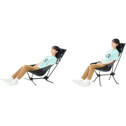 ハイ & ロー切替とリクライニングが可能.軽量でタフなチェア.長時間座っていても疲れにくいヘッドレスト付き&ハイバック仕様に加えて、リクライニングと高さがそれぞれ 2 段階に調節可能なチェア.この 1 脚で 4 パターンの座り方ができるため、食事シーンからリラックスタイムまで、幅広いシーンで活躍する.優れた強度と軽さを兼ね備えた、 7075 超々ジュラルミンを主要フレームに採用.コンパクトに収納でき、持ち運びに便利な収納バッグ付き.【幅広いシーンに合わせて使える】 [ ハイノーマル・ハイリクライニング ] ダイニングチェアとして最適な座高約 40CM 前後で、ハイスタイルのキャンプや BBQ などオールマイティーに使えます.立ち座りもしやすい高さです・