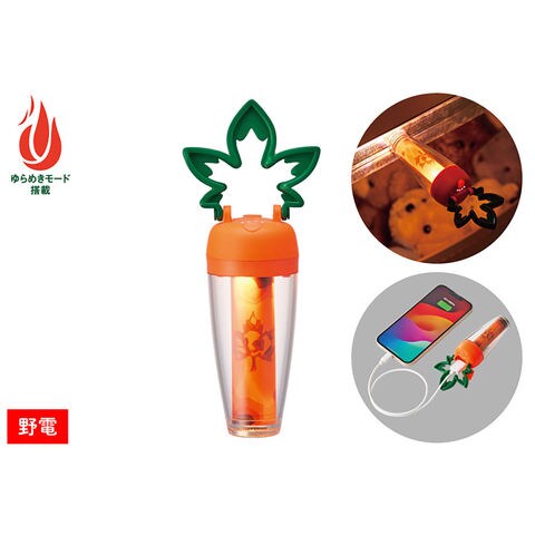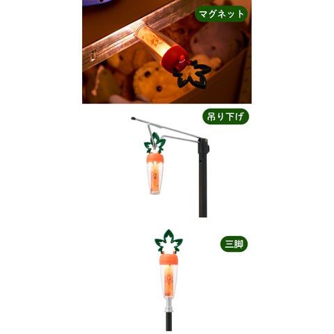 にんじんの見た目をした小型ランタン.暖色点灯すると、よりにんじんらしい見た目に光り、装飾としても使用できる.もちろん点灯モードの変更により白色にも点灯するため、周りを明るく照らすこともできる.小型ながら外部機器への充電ができるパワーバンク機能も併せ持つ.