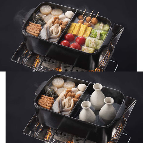 中央で仕切られた角型土鍋.おでんはもちろん、2種類のお鍋や2つのメニューを同時に調理可能出来ます.保温に便利な木蓋が付き、木蓋は[まな板]としても使用可能.別売りの[チューブラルグリル]のフレームや、ピラミッドTAKIBIのゴトクにぴったり固定できる底板付き.
