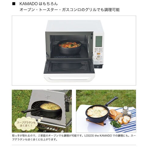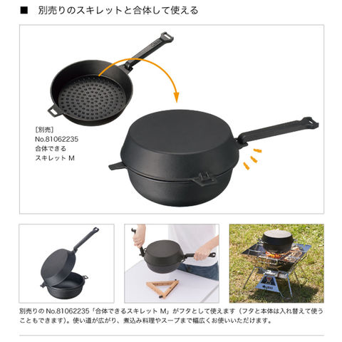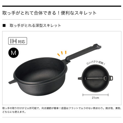 取っ手が取れるので[LOGOS the KAMADOや家庭用オーブンなどでも使えます.焼き物・煮込み料理・スープなど幅広くOK!別売りの[合体できるスキレット M 品番:81062235]と組み合わせればフタとしても使え、用途が更に広がります.IHクッキングヒーターにもご使用可能です.
