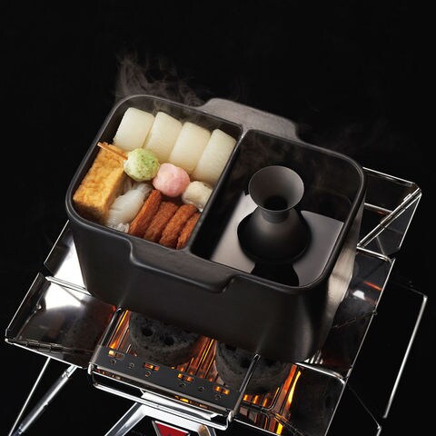 秋冬キャンプで活躍する[仕切おでん土鍋]に1、2人分の調理に適したハーフサイズが登場.中央に仕切りがあるので、2種類の味付けを楽しんだり、熱燗とおでんを同時に温めたりとさまざまな使い方ができる.木蓋は裏返すことでまな板として使用することも可能.