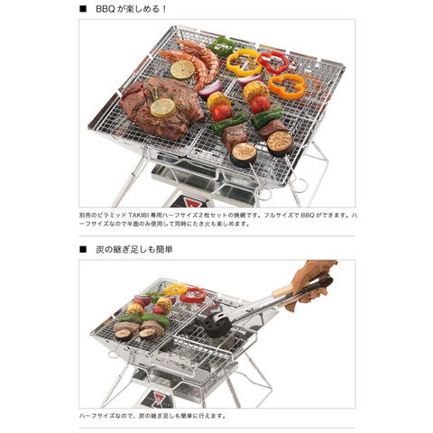 ピラミッドTAKIBI L専用焼網.半面使用なら、たき火とも同時に楽しめます.1枚で半面、2枚で全面、使い分けできます.