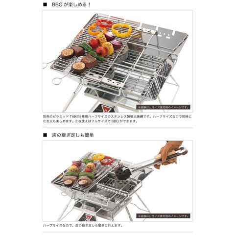 ピラミッドTAKIBI M専用ステンレス焼網.ハーフサイズなので同時にたき火も楽しめます.2枚使えばフルサイズでBBQができます.