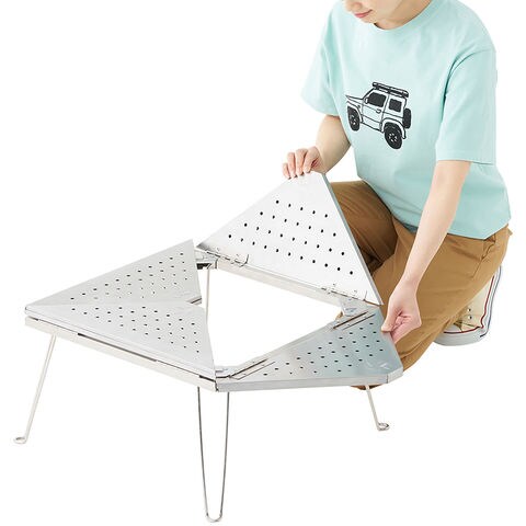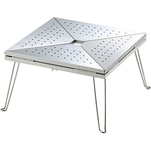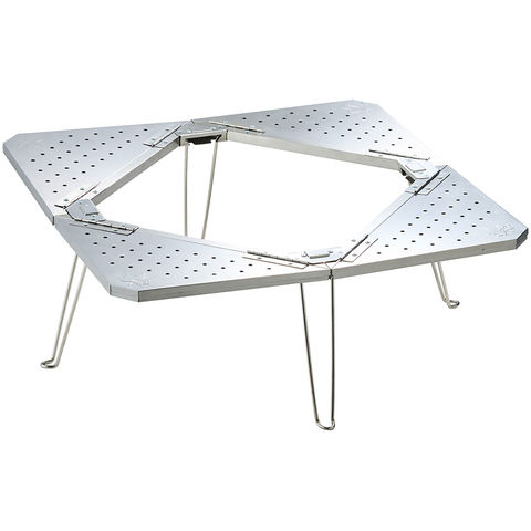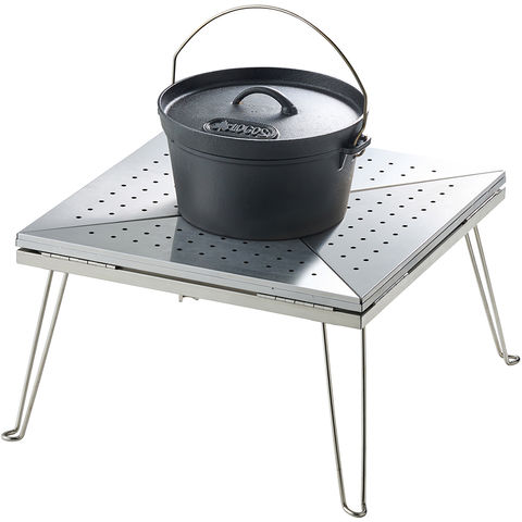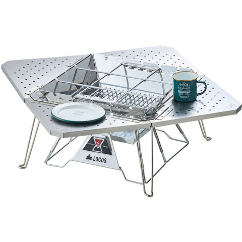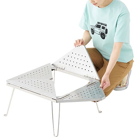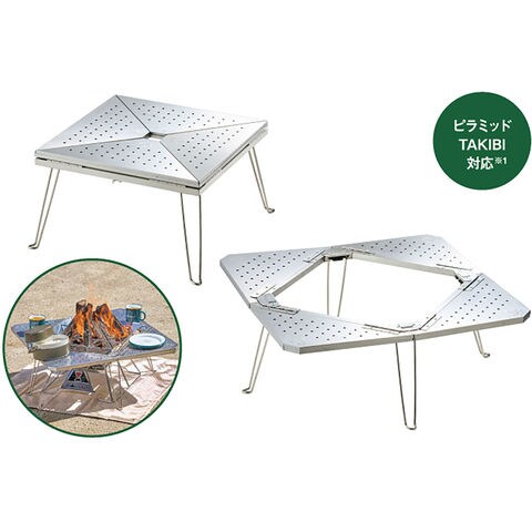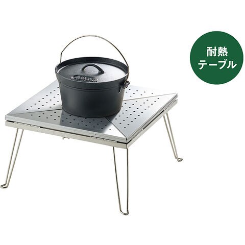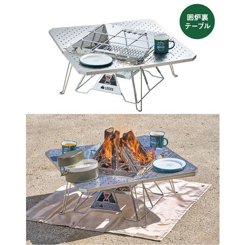 シーンに合わせて囲炉裏テーブルと耐熱テーブルの使い分けができる一台二役 。 囲炉裏テーブルは 、 たき火台を中央に置き 、 その周りを天板で囲う事で囲炉裏スタイルを楽しめます 。 耐熱テーブルでは 、 高温になる小型グリルやアルコールバーナーなどを乗せて使用することができ 、 脚をたたむだけでフラット収納 、 そのまま収納バッグに入れて持ち運ぶことができます 。