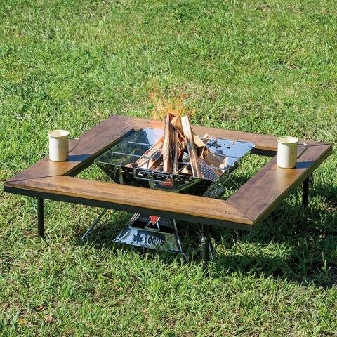 機能:焚火やグリルを囲んで、囲炉裏空間を演出する、木製天板を採用したちょっと特別な[和]の囲炉裏テーブル.ピラミッドTAKIBI XLサイズまで対応.車に収納しやすい[I型収納]形状.収納バッグ付き.