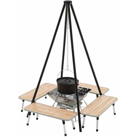 耐荷重約200kgを誇る頑丈な吊り鍋料理スタンドは安定感のある4本脚.マットブラックに塗装されたスチール製のフレームにより重厚感のある仕上がりに.別売りの囲炉裏テーブルやピラミッドTAKIBIと組み合わせて使えば楽しみ方がさらにひろがります.吊り下げるものの大きさに合わせて、チェーンの長さを調節できます.ランタンを吊るせば、ランタンスタンドにもなります.パーツは短くコンパクトに収束できるので、持ち運び・収納にも便利!持ち運びに便利な収納バッグ付きです.