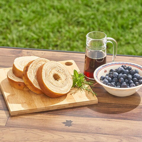 バウムクーヘンを作ろう!金属製のテーブルやグリルにセットして楽しみます.回転バーに生地を掛けながら両サイドから過熱することで、バウムクーヘンが徐々に焼きあがります.お肉の丸焼きやシュラスコも楽しめます.収納バッグ付き.